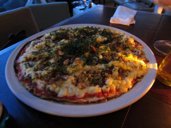 Di Skye Restaurant saya  mencoba Brazilian Pizza yang menggunakan bahan utama keju Brazil. Rasanya enak, tetapi setelah potongan kedua, sudah mulai neg, padahal porsinya satu loyang besar. Ketika memutuskan untuk membawa pulang sisa pizza itu, pelayan  mengatakan bahwa mereka tidak menyediakan Doggy Bag. Jadi mau tidak mau porsi itu harus dihabiskan. Kenyang sekali. Tapi yang paling menyebalkan adalah ketika diberikan sekeranjang roti yang kami kira gratis dan ternyata harganya selangit.