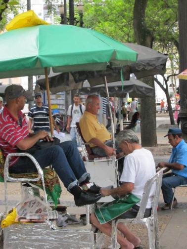 Saya menyebut area terpojok halaman gereja dengan  ‘area semir sepatu’ karena disitu terdapat beberapa kursi yang diletakkan diatas panggung kecil yang terbuat dari triplex dan dihiasi payung pantai besar. Di kursi-kursi itu duduk beberapa pria yang sepatu mewahnya sedang dibersihkan dan disemir oleh pria-pria yang duduk dikursi yang lebih rendah.  Suatu pemandangan yang sudah jarang disaksikan.