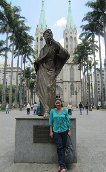 Di depan gereja terdapat patung besar Santo Paulus, yang menjadi inspirasi nama kota ini, Sao Paulo. Warna pada bagian jari-jari kaki patung ini sudah memudar. Menurut tour guide kami, banyak orang berdoa sambil menyentuh kaki patung ini yang alkisah membawa berkah dan keberuntungan. Tanpa pikir panjang saya pun ikut menyentuh kaki patung itu , dan tentunya tidak lupa untuk berfoto bersama.