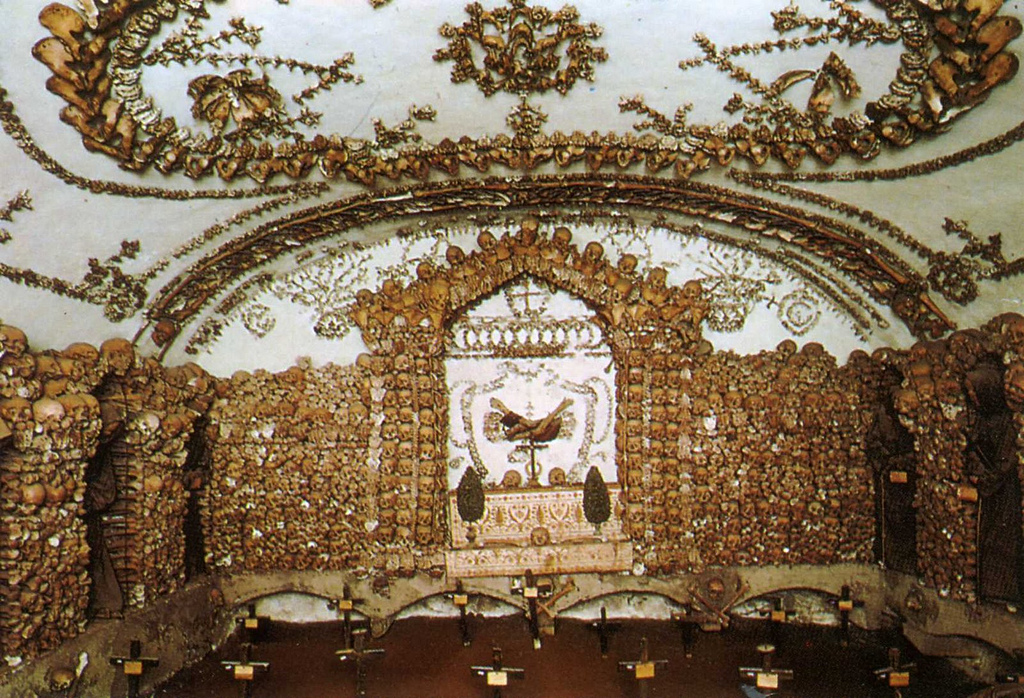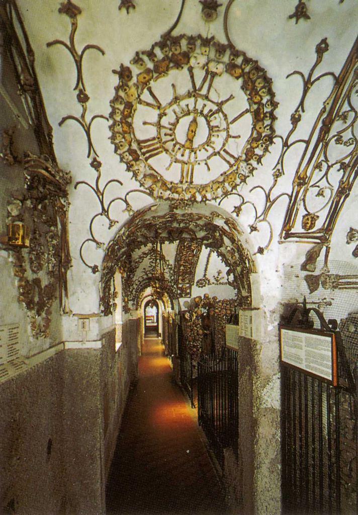 Koridor yang penuh dengan hiasan tulang manusia. Lorong kuburan ini dibagi menjadi 6 kapel kecil