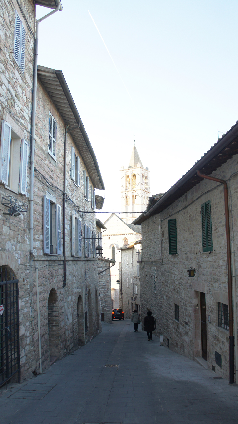 Selama di Assisi, kegiatan yang paling saya nikmati adalah berjalan di gang-gang sempit yang  memberikan kejutan-kejutan baru di tiap lorongnya. Jalan sempit ini lebarnya hanya muat untuk dilalui 1 mobil.  Semakin saya berjalan menjauh dari pusat kota, semakin sepi suasananya. Sekali kali saya akan berpapasan dengan orang lokal yang sibuk dengan kesehariannya seperti mengantar anak sekolah, berbelanja, mendorong mobil yang mogok, dan seterusnya. Tapi jangan kuatir. Tidak mungkin nyasar. Selain karena kotanya sangat kecil, penunjuk jalan juga terdapat hampir dia tiap simpangan.